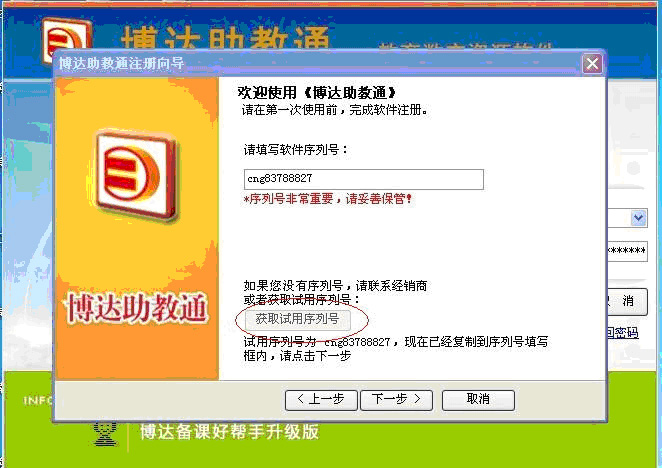 其一,没有博达助教通账号(也没有博达教育网账号)的,直接选择获取试用序列号,(见下图中红色椭圆框标记处):