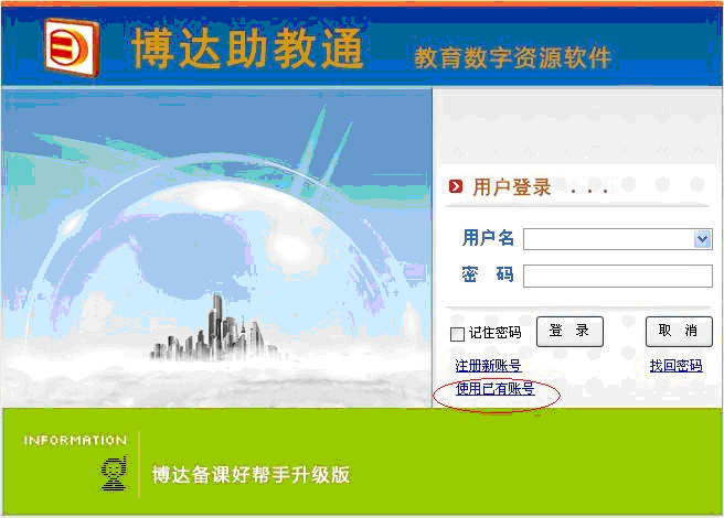 其二,已经拥有博达助教通账号或博达教育网账号,单击“使用已有的博达助教通账号登录”选中(见下图中红色椭圆框标记处):