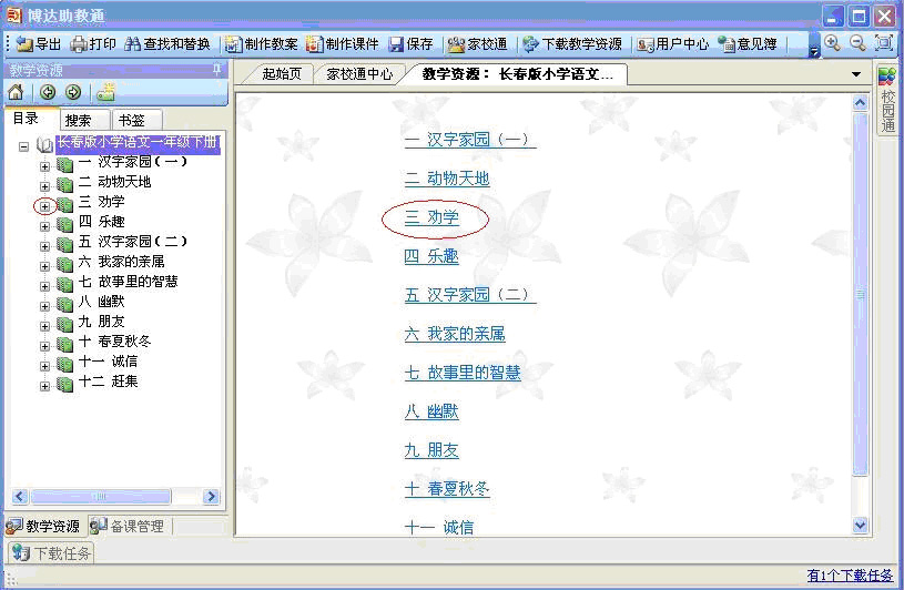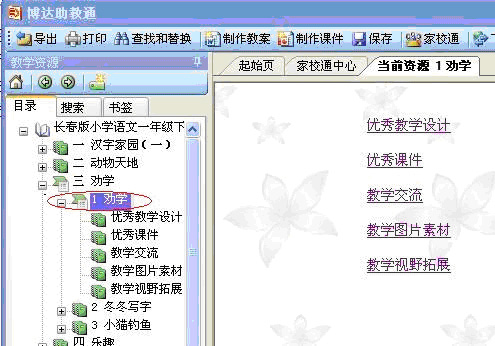 助教通以纵(教材和知识点)、横(按资源类型,包括教案、多媒体资料、课件、试卷与练习、背景知识、学科博览等)组织资源。既解决了困扰教育系统多年的优秀教学资源匮乏,教师们“巧妇难为无米之炊”的问题,又为教师们提供了简单易用的开放式教学平台,利用资源轻松编写教案、制作课件,让各个学科的教师都能利用信息技术备课、教学、研究。 一般下载下来的教学资源如下图界面展开,您可以直接在左侧目录中点击进行选择,也可以点击右侧窗体上的超链接进行选择。比如说,现在开始学习“三 劝学 1 劝学”,那么直接点击左侧的标记处或右侧的标记处。