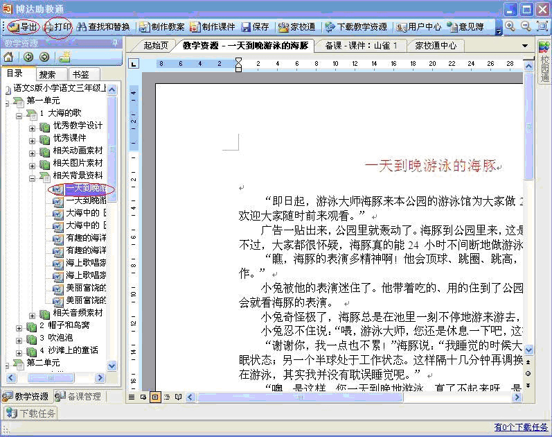 对于文字类资源,只需点击即可在窗口看到;如果需要导出,在窗体的左侧目录中选中需要的目录,点击工具栏中得“导出”,或“打印”。