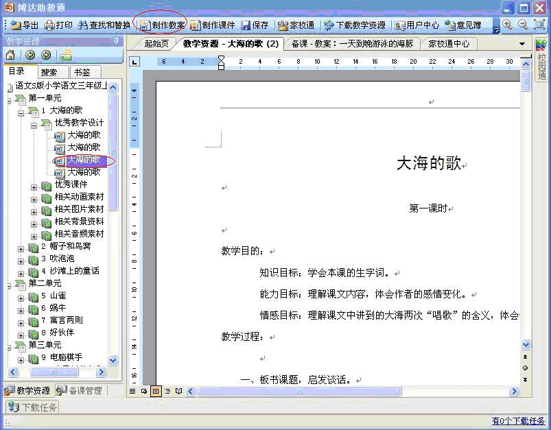如果需要编写教案,首先请选定参考教案,然后单击右键在菜单中选择“制作教案”,或者在工具来中直接点击“制作教案”,即可对教案进行编写了。