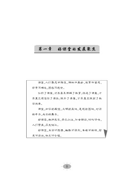 第一章 好课堂的发展聚焦 课堂,人们熟悉而陌生,神秘而美妙,欣赏而留恋, 珍贵而难忘,困惑而迷茫。 认识了课堂,才算真正理解了教育;改造了课堂,才 算真正理落实了课改;提升了课堂,才算真正提高了教 学效率。 课堂,知识的殿堂,文明的圣地,思想的园地,对话 的平台,成长的舞台。 好课堂,教师追求,学生向往,社会期待,时代呼唤, 人们赞美,历史铭记。 好课堂,生动而形象,幽默而深刻,准确而精辟,智 慧而启迪,快乐而幸福。 1