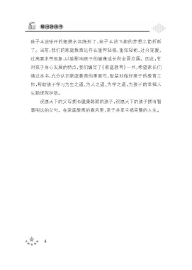 孩子本该张开的翅膀永远隐形了,孩子本该飞翔的梦想之箭折断 了。当前,我们的家庭教育还存在重智轻德、重知轻能、过分宠爱、 过高要求等现象,以致影响孩子的健康成长和全面发展。因此,针 对孩子身心发展的特点,我们编写了《家庭教育》一书,希望家长们 通过本书,充分认识家庭教育的重要性,智慧地做好孩子的教育工 作,帮助孩子学习为生之道、为人之道、为学之道,为孩子的幸福人 生路保驾护航。 祝愿天下的父母拥有健康聪颖的孩子,祝愿天下的孩子拥有智 慧明达的父母。在家庭教育的春风里,亲子共享幸福完整的人生。 4